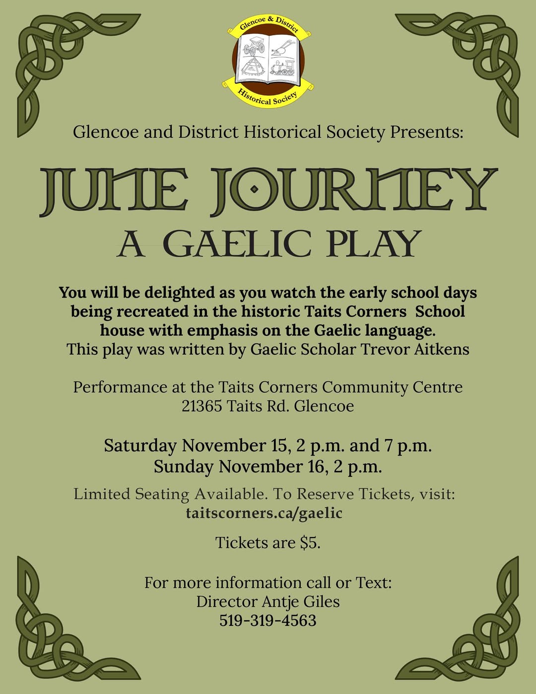 Three performances. For details, call or text Antje Giles 519 319 4563.
